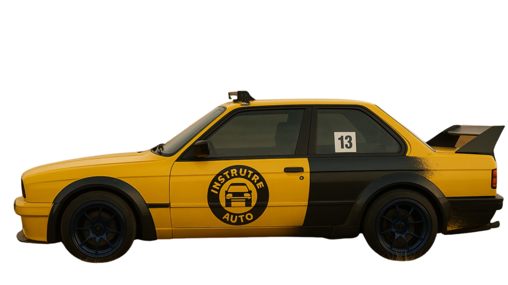Lecțiile practice se desfășoară pe un BMW E30 pregătit special pentru drift, dotat cu rollcage, scaune și centuri sport, sistem de frânare și transmisie adaptate pentru derapaj controlat.